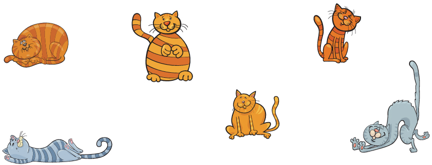 Sieben Katzen (Bo, Herzog, Fufi, Dame, Prinzessin, Rover und Spoke) sind in ihrem Körbchen auf der Katzenausstellung gewesen. Aber weil der Wächter vergaß die Türen zu schließen, gingen sie nachts hinaus.