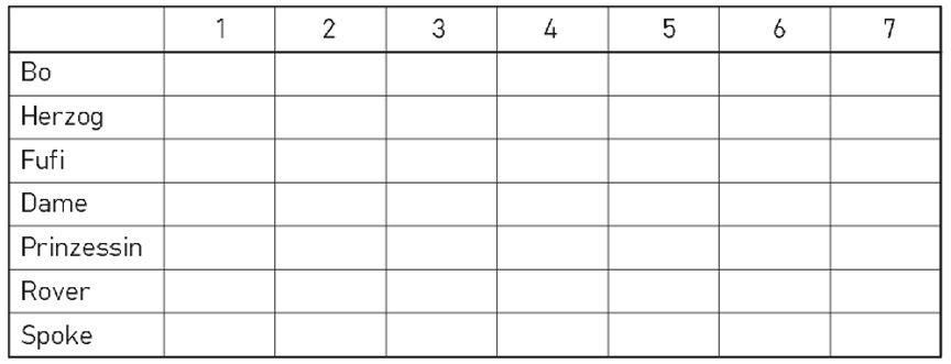 Fufi, Prinzessin, Dame, Herzog, Rover, Bo, Spoke