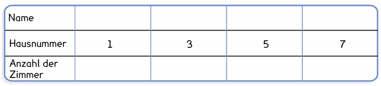 Finde heraus, wer in welchem Haus wohnt und wie viele Zimmer das Haus hat.