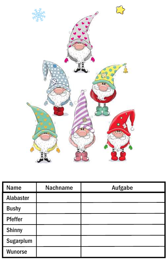 hilfreich und sehr schlau. Sie helfen dem Weihnachtsmann beim Entwerfen von Spielzeugen und den Wünschen von Kindern, die mit der Post gesendet werden. Sechs der Elfen sollte jedes Kind kennen.