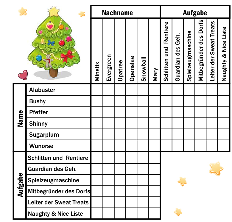 kümmert sich nicht um die Nice Liste. - Drei Elfen sind Bushy, Sugarplum und Wunorse, und