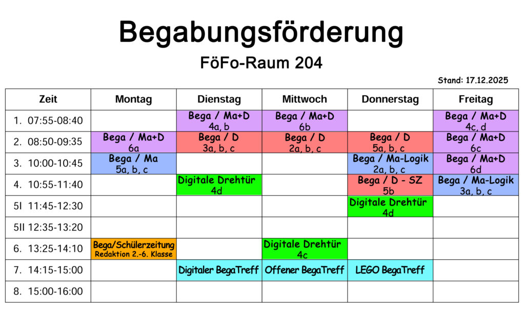 Der Kursplan zeigt eine zeitliche Orientierung zu den verschiedenen BegaAngeboten in den unterschiedlichen Klassenstufen.